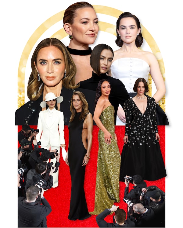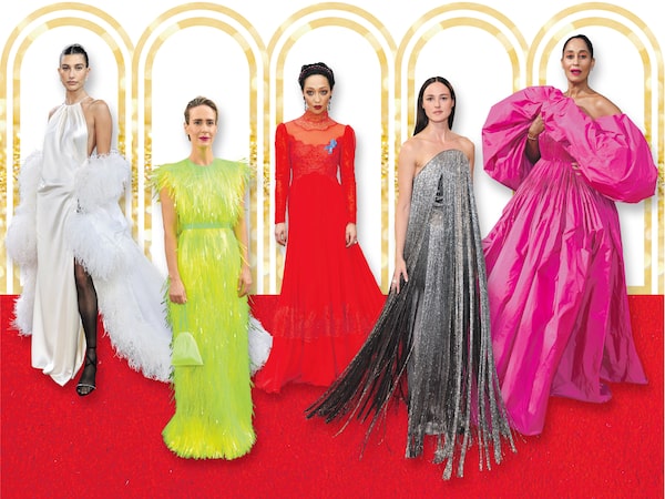 Memorable looks styled by Karla Welch: Hailey Bieber in 2022, Sarah Paulson in 2018, Ruth Negga in 2017, Renate Reinsve in 2026 and Tracee Ellis Ross in 2018.Photo illustration by The Globe and Mail/Getty Images/The Globe and Mail