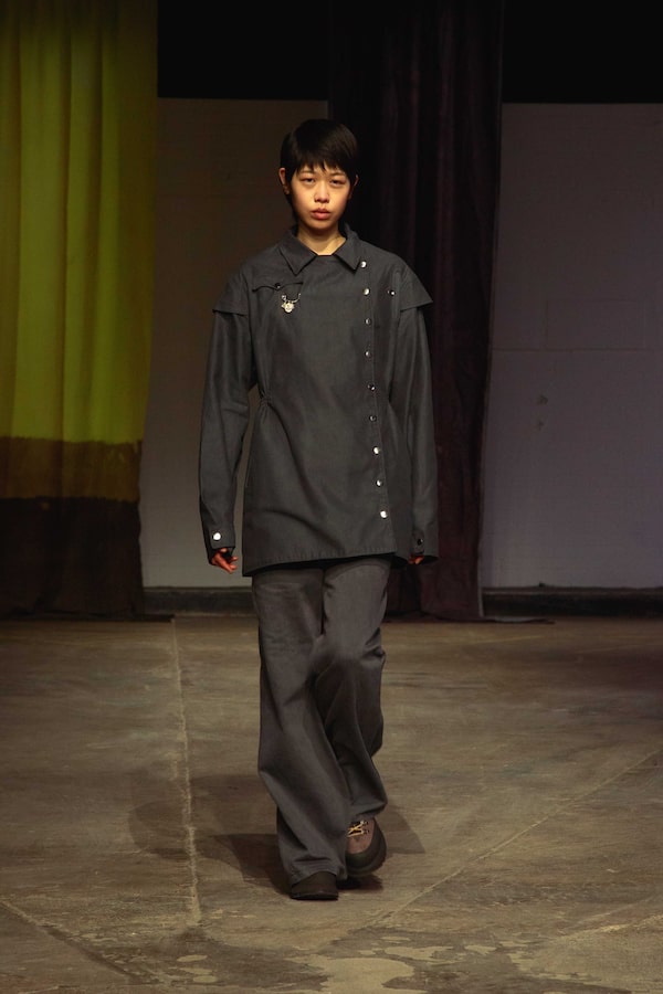 At Yuhan Ao’s presentation, an elegant duster coat had a line of peekaboo buttons along the back for maximum dramatic effect. Luscious, lightweight organza trenches and a coat with a split-tail detail resembling the style favoured by concert pianists were also on view.