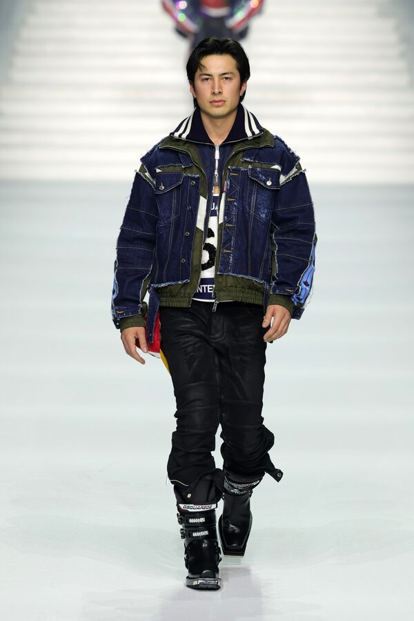 More than any other label, the Dsquared2 catwalk served as a cultural aperitivo to the upcoming 2026 Milano Cortina Olympic and Paralympic Winter Games. Forgoing a polite curtsy at the finale, the Caten brothers, wearing custom-made Dsquared2 hockey jerseys, concluded their show by striding atop the shoulders of two strapping young models.