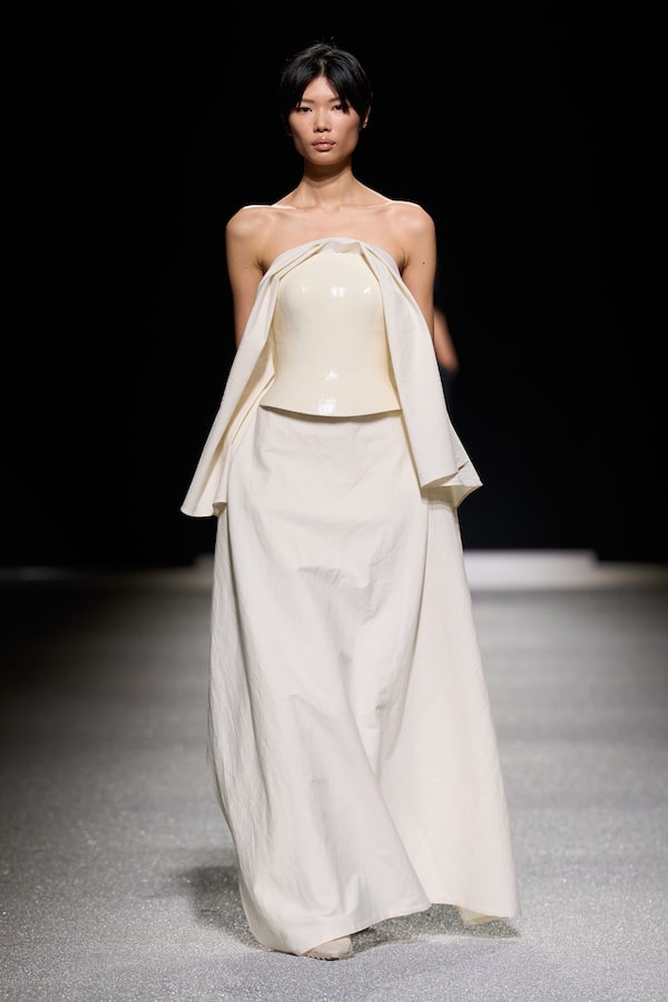 We saw lacquered bodices at Japanese label Issey Miyake, where washi paper and glue were layered onto 3-D moulds. Victoria Beckham’s evening looks – her most daring to date – took inspiration from Art Deco artist Tamara de Lempicka with sculpted, angular cutouts shielding the chest. And at Courreges, models wore delicate panels covering the chest to the collar bones.