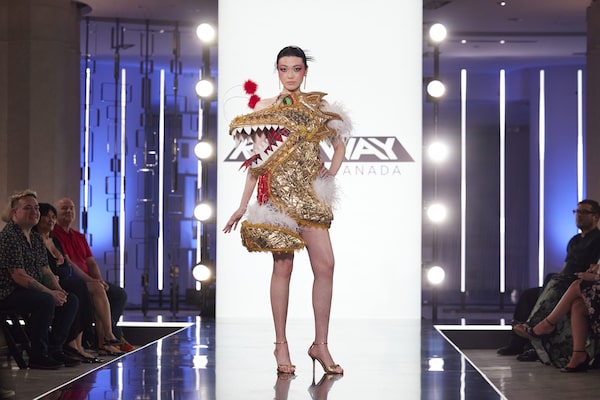 The next morning, we’re thrust straight into the fervour of show day: The runway is being prepped, the room is buzzing with VIP attendees and the designers are racing through model fittings so quickly you can see the sweat beading on their brows. (“Can someone get me a tissue?!” Lu exclaims.)