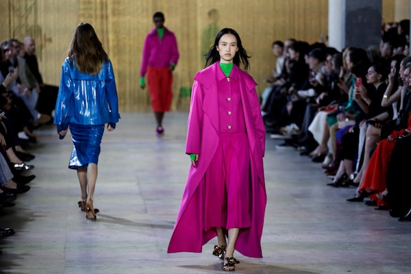 The standout colour of the season? A saturated, vibrant violet, which appeared on everything from suiting to coats. Most notable, though, were the purple dresses in a wide variety of fabrications at Loewe, Gucci, Ferragamo and Carolina Herrera.