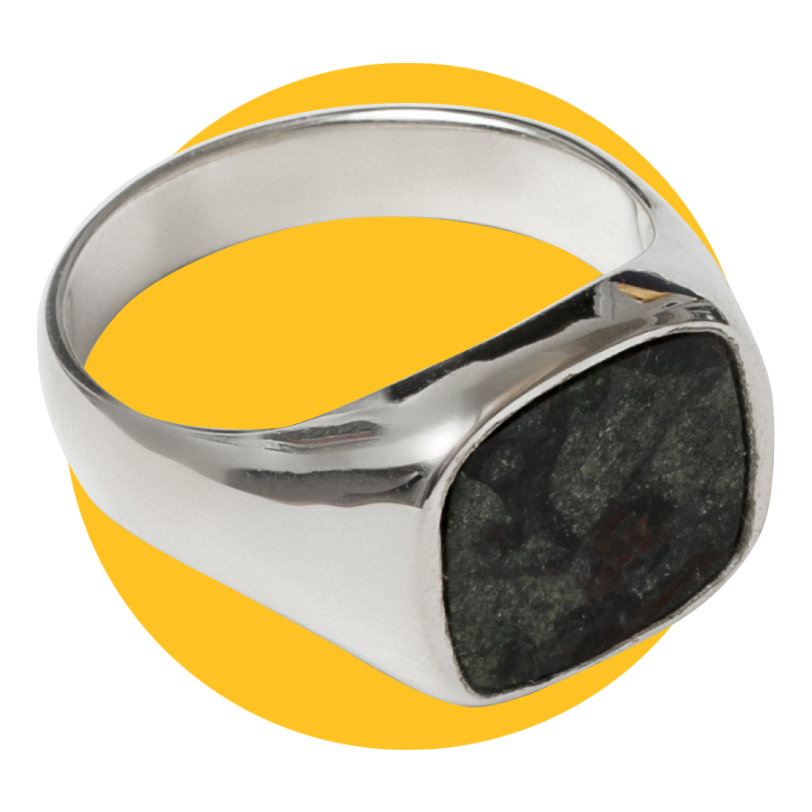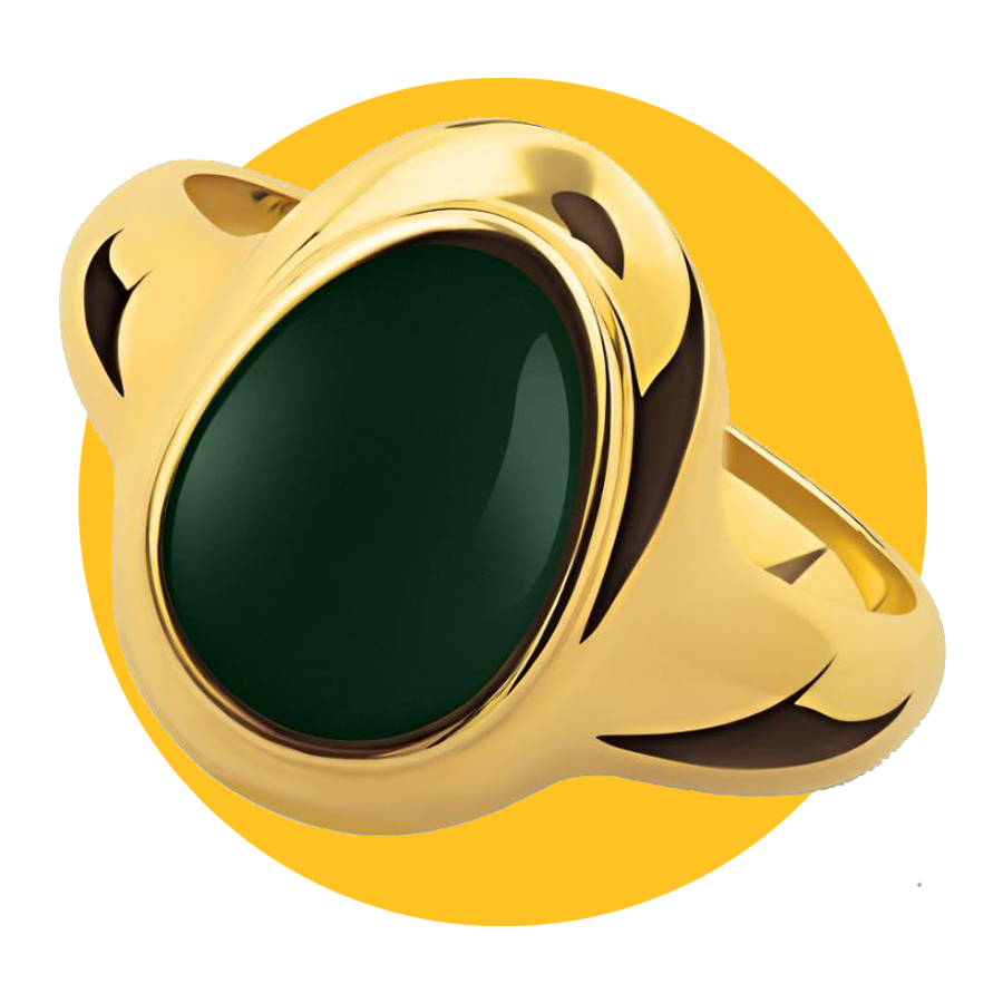 Signet rings continue to be in fashion, and this one is handcrafted in Vancouver using recycled 925 sterling silver with a green gemstone inlay. It’s a sculptural, minimalist design that looks good on any finger.