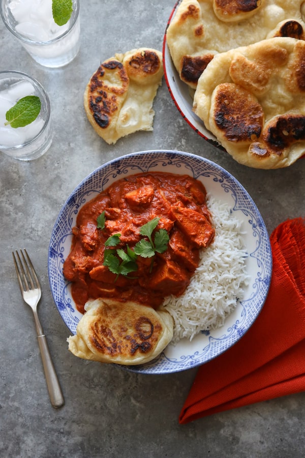 When it comes to butter chicken, it’s all about the sauce – a sweet, mild, cream-of-tomato-y sauce that begs to be scooped up with chewy naan, which you can make at home in a hot skillet in the absence of a tandoor.