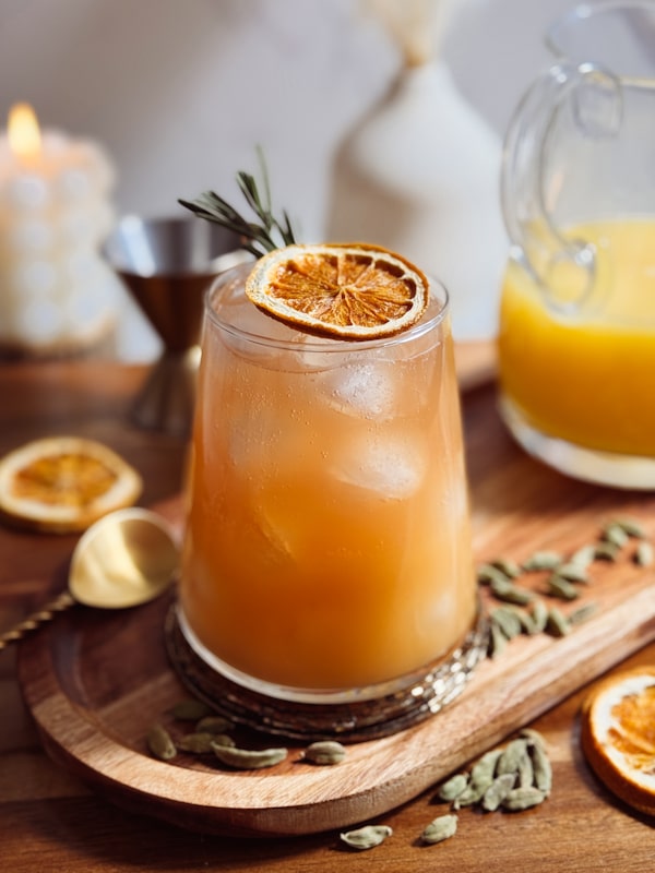 In a cocktail shaker with ice, combine ½ oz of the cooled cardamom syrup, plus the next five ingredients and shake briefly to chill. Strain into a chilled stemless wine glass and top with non-alcoholic sparkling rosé. Garnish with a dehydrated orange wheel or a cinnamon stick.