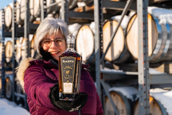 Barb Stefanyshyn-Cote holds a bottle of Black Fox’s single-grain whisky. The distillery won Worldwide Whisky Producer of the Year at the International Wine and Spirits Competition.Black Fox Farm & Distillery/Supplied