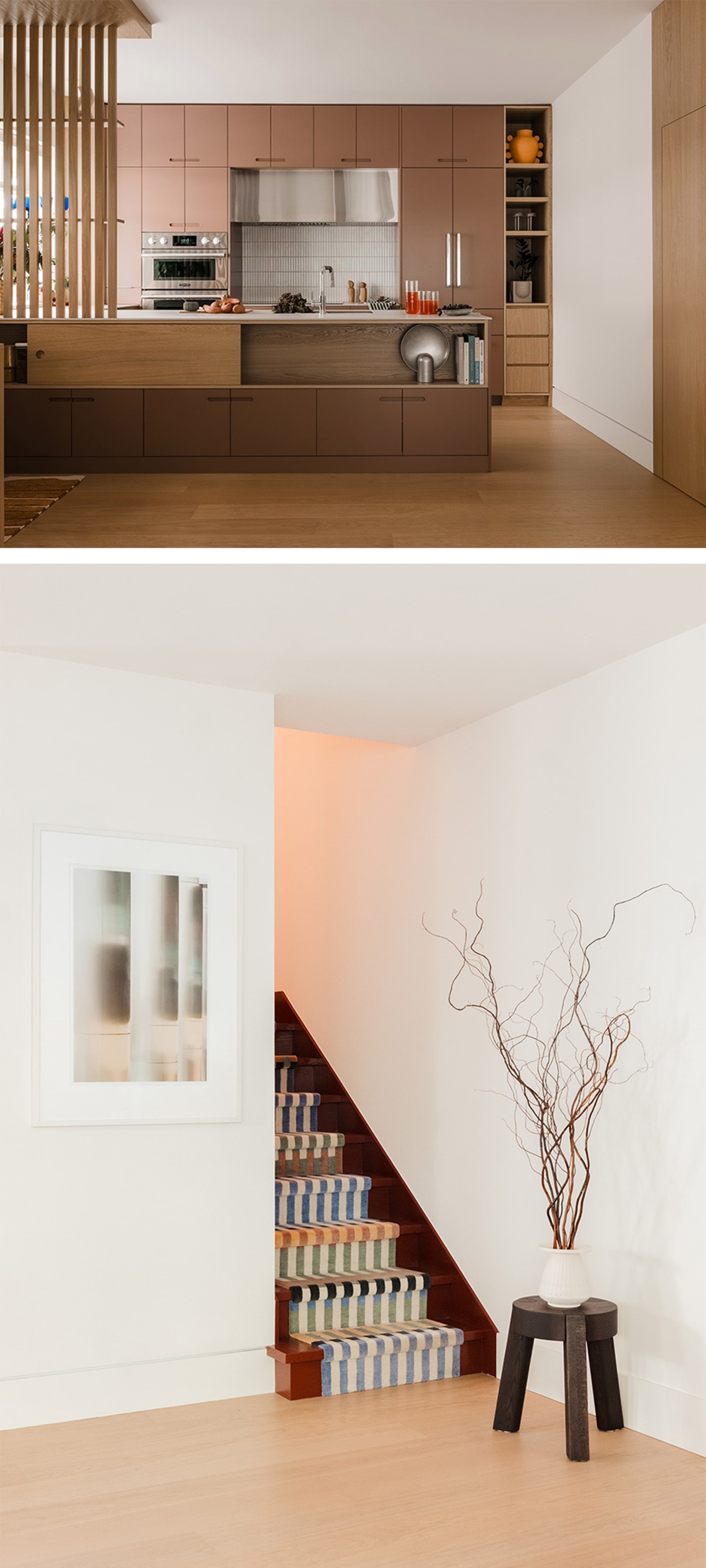“The Bauhaus also had an affinity for colour,” Jae says. “As do I. So, I wanted to imbue colour where I could.” A runner climbs the stairs, patterned with rectangles in bright, primary hues. The kitchen itself pops with reddish-purple cupboards. “One surprise for me is how much I enjoy the colour,” Jeanette says. “It’s unusual, but when the light hits it, it glows.”