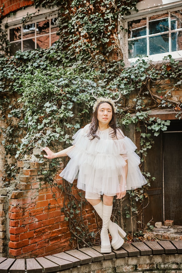 This outfit is a remix of some pieces I wore during my wedding. The centerpiece is a Simone Rocha look; on most folks, this piece would be worn as a vest but on me, it’s kind of a mini dress. I wore it with Steve Madden platform shoes and my go-to shorts from a now-closed shop in New York called OA. The crown is something I bought on Etsy, and it’s my homage to an Alexander McQueen collection where the models wore these antler-like headpieces. For my wedding, I wore it with some tulle covering it for the ceremony; now, I’ll wear it as-is to concerts. The Spinelli Kilcollin ring is my custom engagement ring, and I’m also wearing Simone Rocha pearl jewellery.