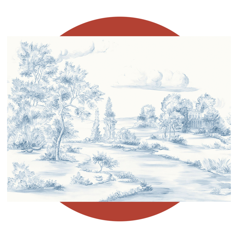 The mural lining the room was hand painted by decorative artist Anya Kazimierski, and the scene is reminiscent of the dreamy landscapes found in Susan Harter wallpaper.