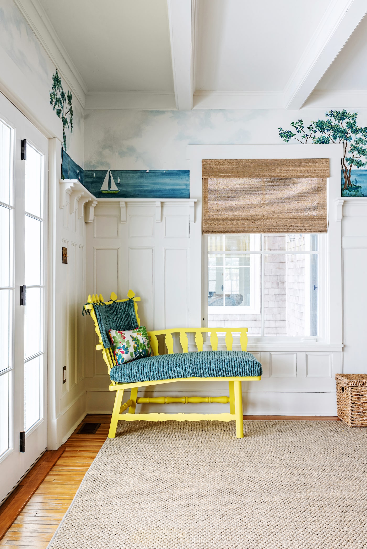 Armour kept the original architecture intact. No walls came down. No wood was removed. Instead, she painted much of the panelling white and layered in accents that are a little bit Caribbean, a bit Canadian East Coast. “Chester is known as the Cape Cod of Canada,” she says. “But I also wanted to amplify that warm summer vibe with corals, yellows and aquas.”
