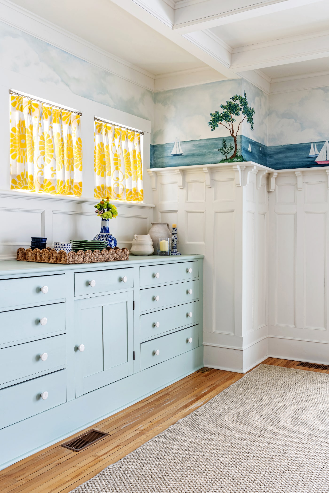 Victoria Armour’s dining room is crowned with a mural depicting a leisurely day on the coast. Crisp white sailboats glide across calm blue water, with green trees lining the shore.