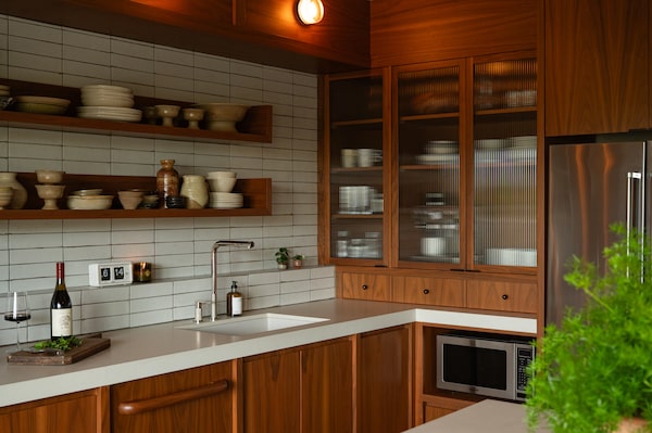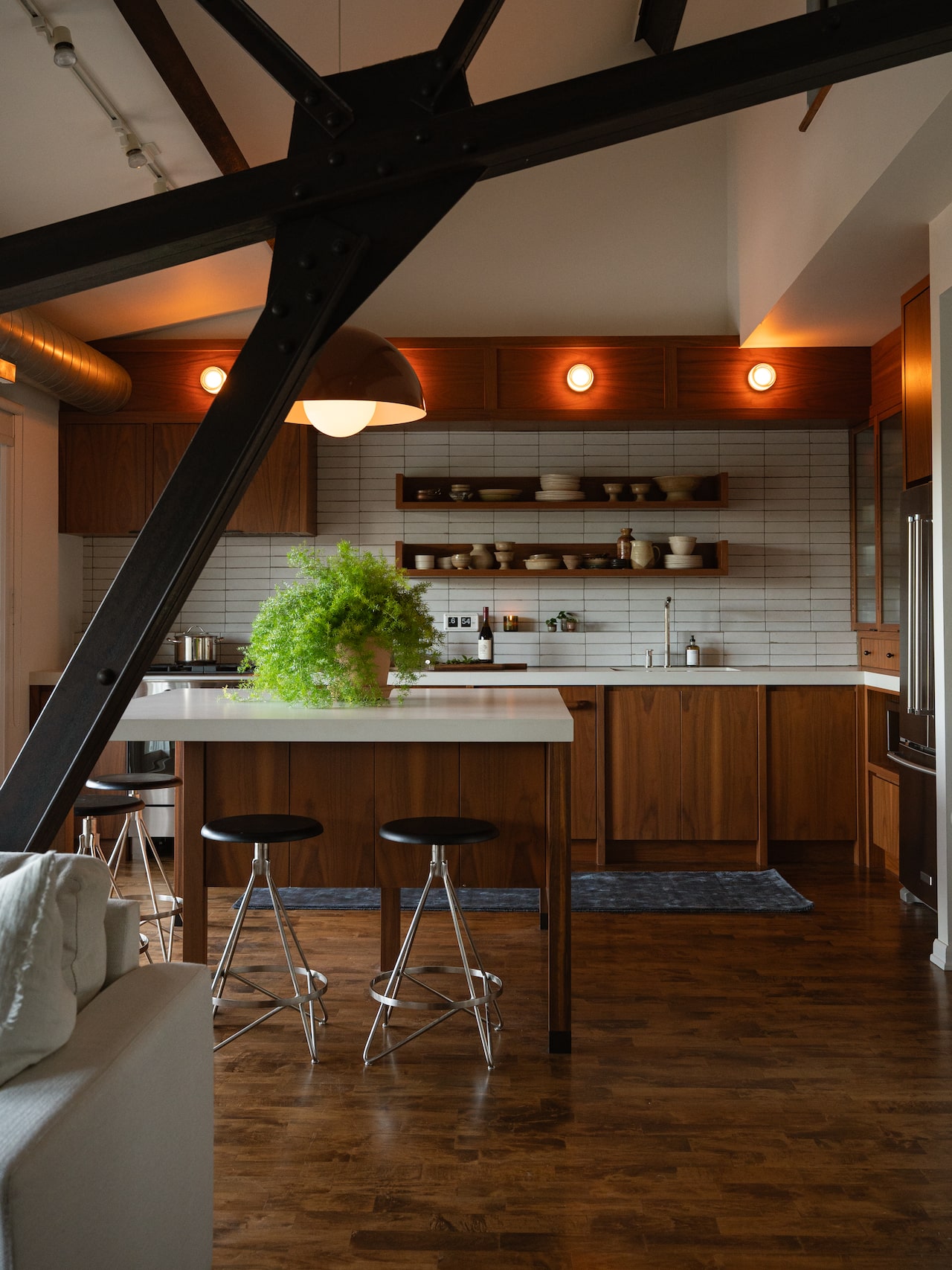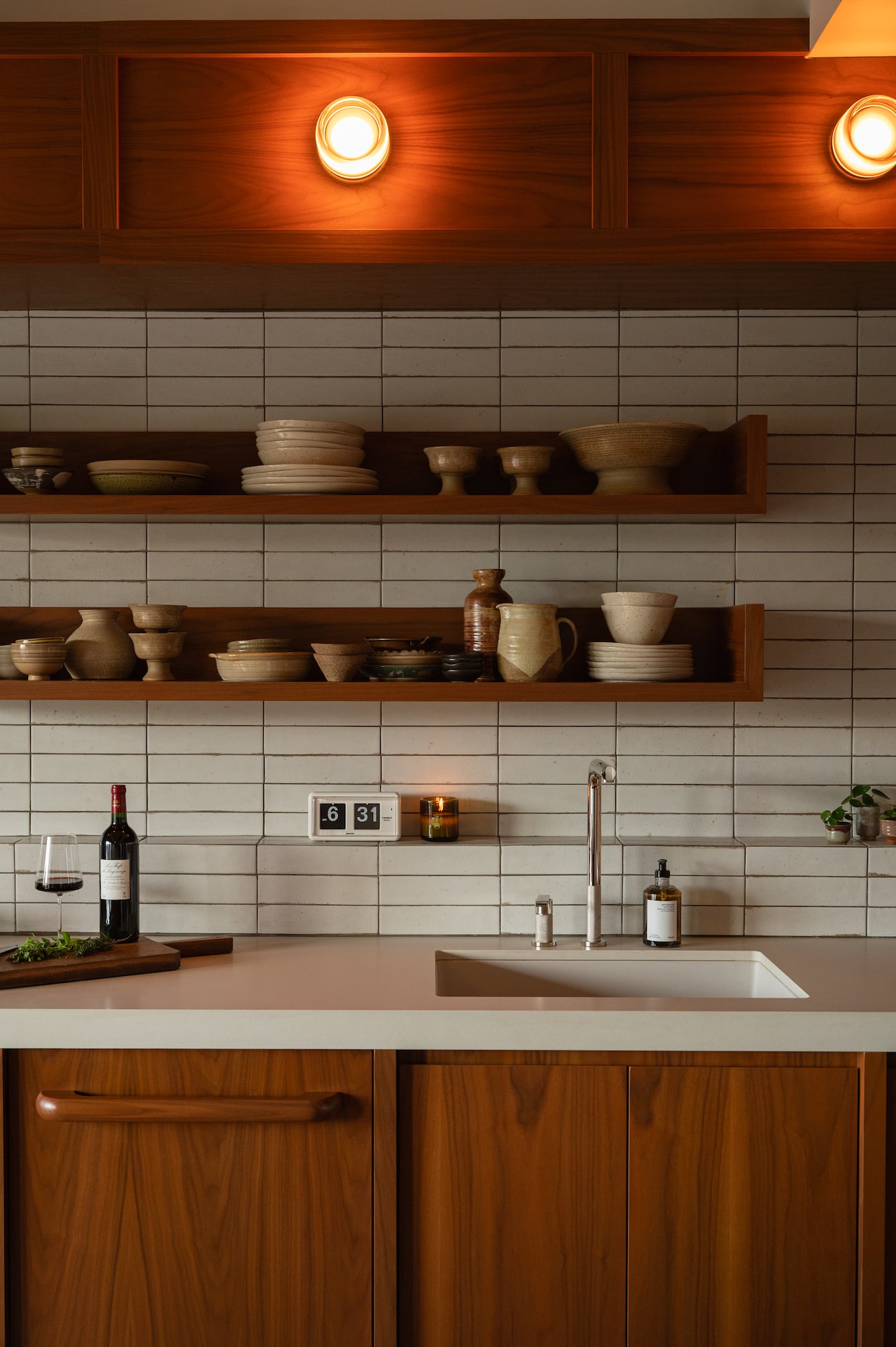 The result is a contemporary take on Mad Men style. It’s a character-filled space with rich cherry cabinets custom-built by One Plus Kitchen. The reddish wood contrasts with soft white accents, such as the tiled backsplash and quartz counters (with a matching off-white sink), and glows under soft amber light from a series of wall-mounted glass sconces.