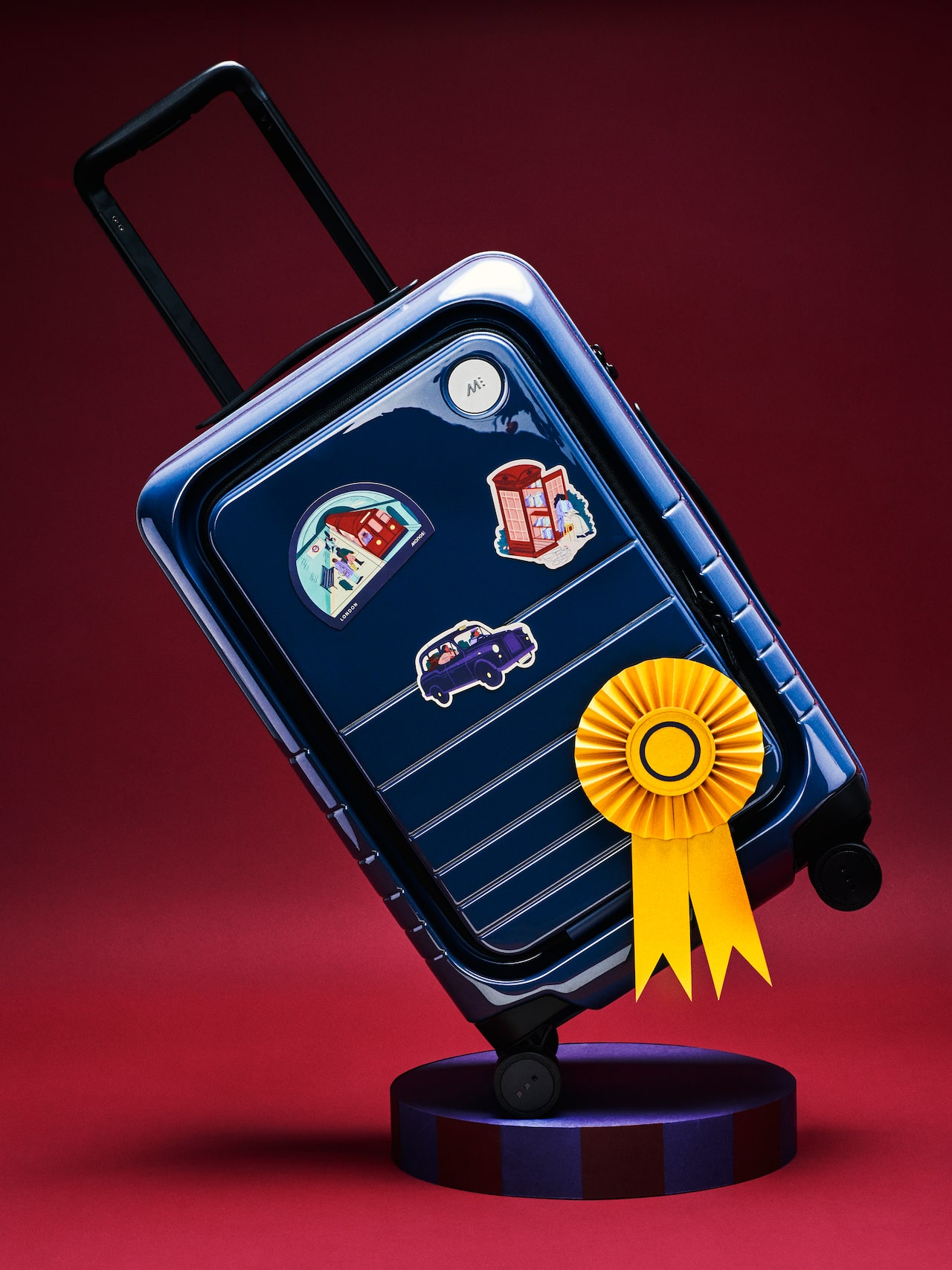 Carry-On Pro Plus suitcase, $415, destination stickers, $30, at Monos (ca.monos.com).