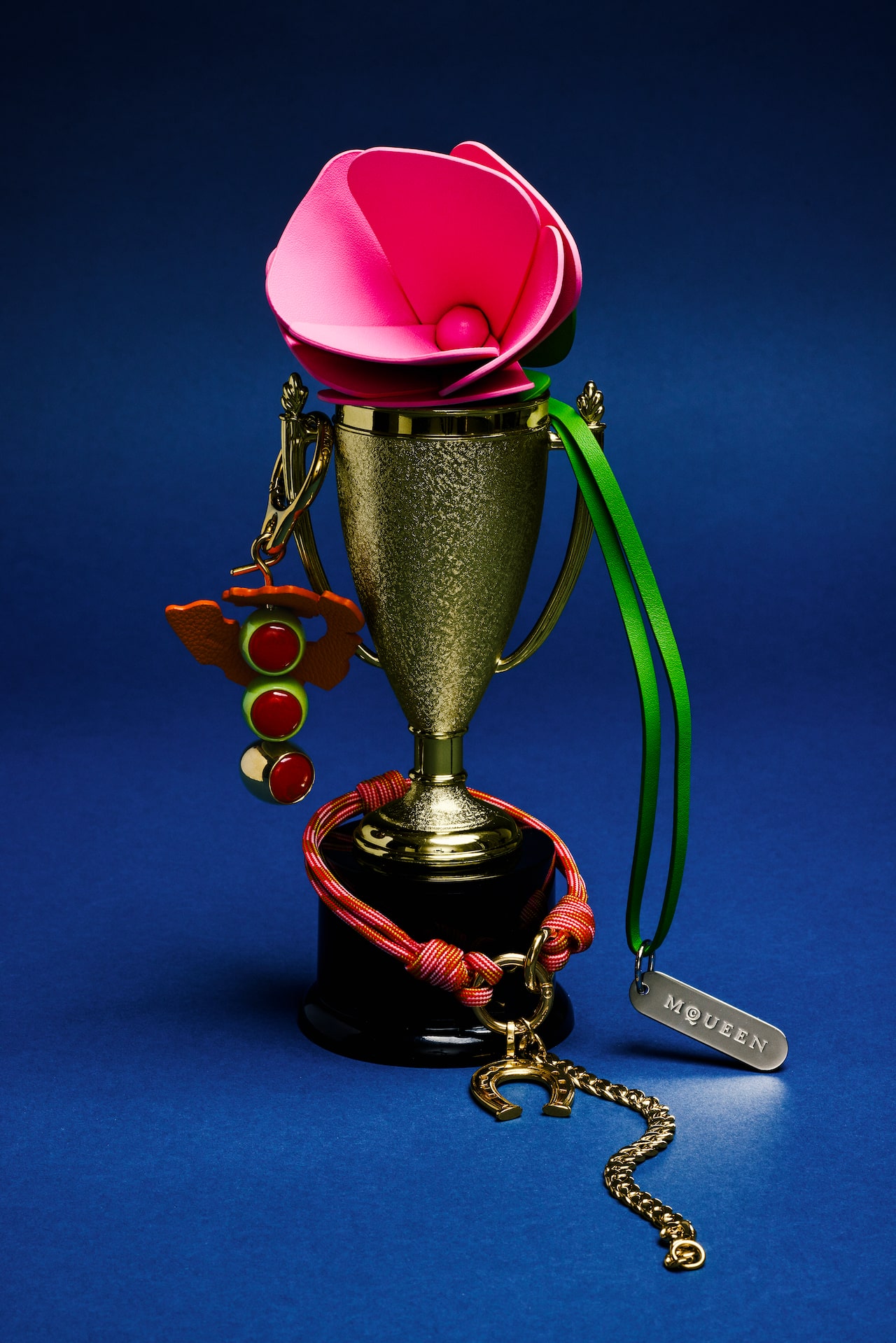 Loewe martini olives bag charm, $750, Alexander McQueen flower bag charm, $540, Martha Calvo Wish Me Luck bag charm, $215 at Holt Renfrew (holtrenfrew.com).