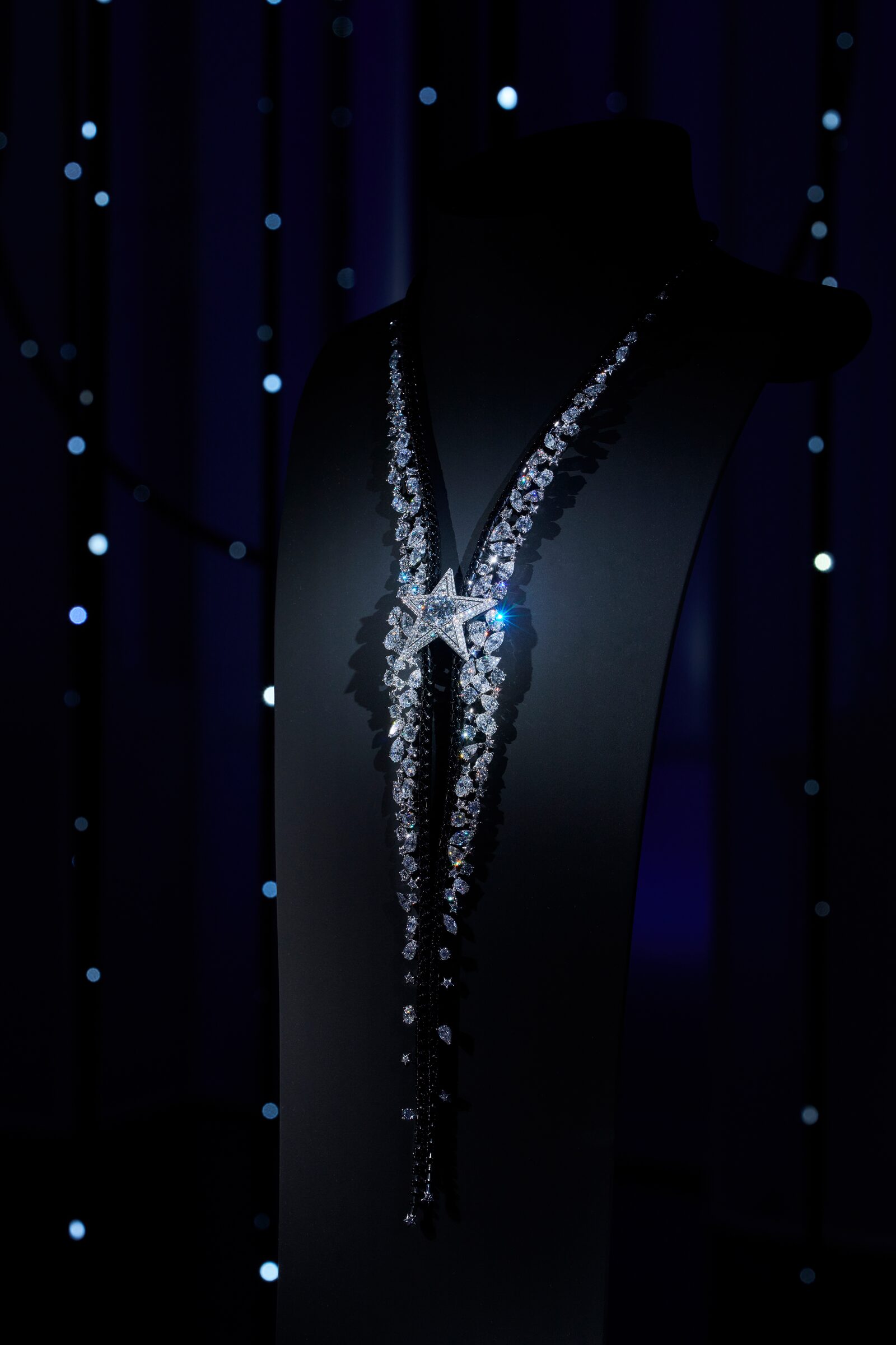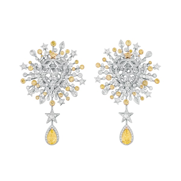 There is an array of otherworldly sparkle to appreciate in its 113 pieces. Chanel has a tradition of playing with clothing details in its jewellery – the 2023 collection, Tweed de Chanel, articulated those nubbly textiles in shimmering new ways – and one of the literal stars of this latest collection is the Dreams Come True necklace. It mimics the form of a dress collar in white gold, with a diamond-studded, five-point pendant at its centre.