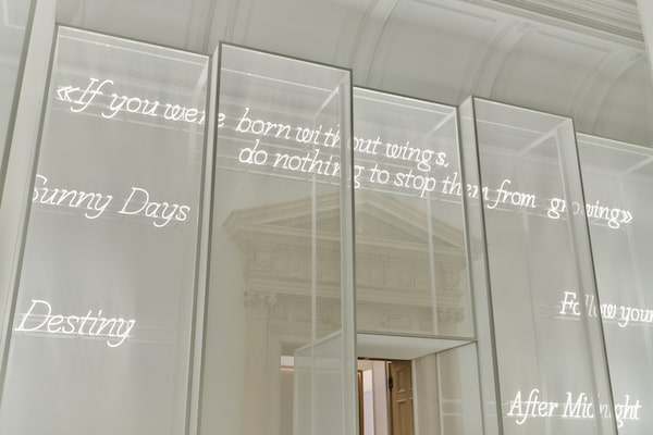 Earlier in the day, there was an equally celestial feeling in the historic hall of the Kyoto National Museum. Beyond a reception room draped with white gauze and ethereal phrases in neon script (“Touch the sky,” “Dreams come true”), jewellery pieces glowed in a dark, mirrored installation.
