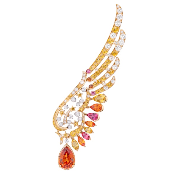 “We have many symbols that are part of our universe,” Saintville says. “Each new one contributes to the enrichment of our signature and style.” According to Saintville, the winged silhouettes of Chanel dresses, again from the 1930s and worn by Hollywood actresses, were channelled into feathered details for the first time. Today, on the red carpet, statement jewels appear as often on a tuxedo’s lapel as a slinky dress. For those moments, there is the Sunny Days brooch. Its yellow sapphires, spessartite garnets and pink spinels capture the dreamy palette of a sunset before it fades to black.