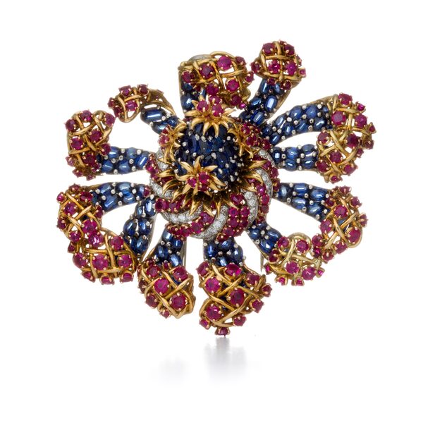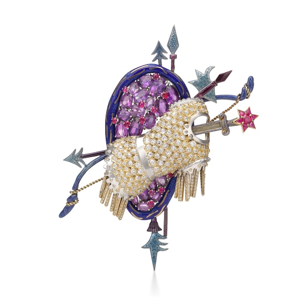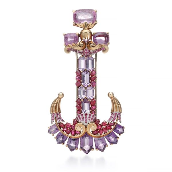 Jean Schlumberger began his jewellery career in the 1930s, after moving from the Alsace region of France to Paris in his 20s. Legendary fashion surrealist Elsa Schiaparelli asked Schlumberger to create buttons for her clothes and jewellery for her circus-themed couture show in 1938. The chessmen, locks and miniature hand mirrors played into Schiaparelli’s love of surrealism. One year later, Schlumberger designed this Anchor Brooch in gold and platinum with pink sapphires, rubies and amethysts for his own collection.