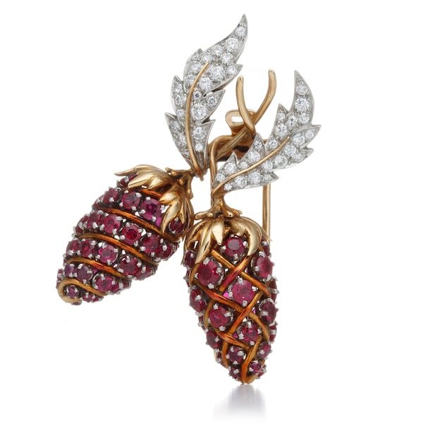 After serving in World War II, Schlumberger moved to New York and set up his own jewellery house. He joined Tiffany & Co. in 1956, the same year he designed this Two Fruits and Leaves brooch in gold and platinum with diamonds and rubies. John F. Kennedy bought one for his wife, Jackie, to mark the birth of their son, John Jr., and Robert Downey Jr. wore a similar version to the 2025 Academy Awards.
