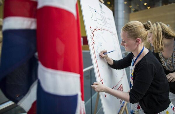 Employees of the British Embassy in Berlin, Germany, write down their congratulations and wishes on July 23, 2013, to Britain's Prince William and Kate, Duchess of Cambridge on the birth of their son.Gero Breloer/The Associated Press
