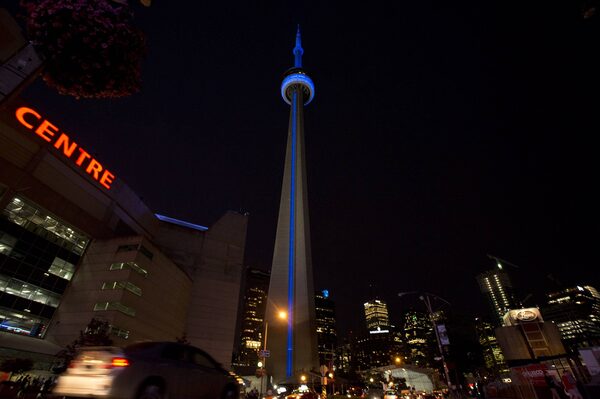 The CN Tower is lighted blue to celebrate the birth of the royal child, on Monday July 22, 2013.FRANK GUNN/The Canadian Press