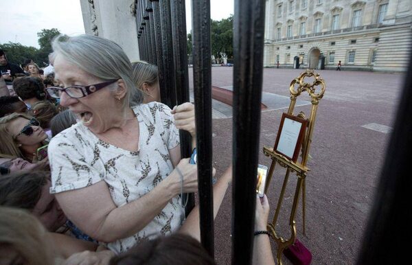 People look through the railing of Buckingham Palace in London at a notice proclaiming the birth of a baby boy to Prince William and Catherine, Duchess of Cambridge.Sang Tan/The Associated Press