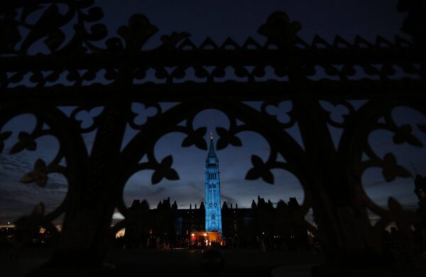 The Peace Tower on Parliament Hill is lit blue to celebrate the birth of a baby boy to Britain's Prince William and Catherine, Duchess of Cambridge, in Ottawa July 22, 2013.CHRIS WATTIE/Reuters