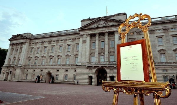 A notice formally announcing the birth of a son to Britain's Prince William and Catherine, Duchess of Cambridge, is placed in the forecourt of Buckingham Palace on July 22, 2013.NEIL HALL/Reuters
