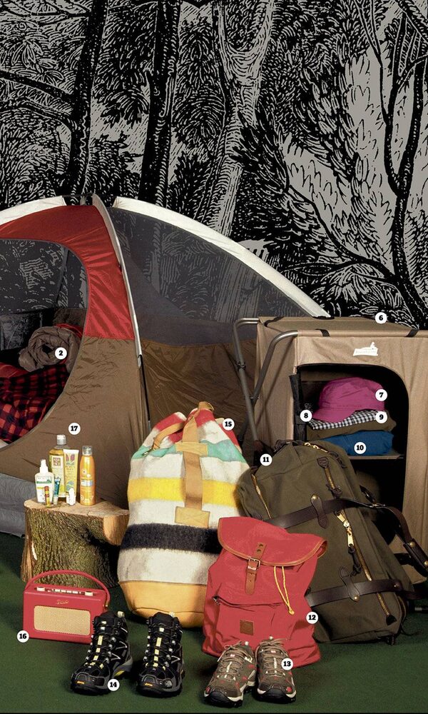 17: Life Brand Sunthera3 Sensitive Skin Sunscreen SPF 60 Continuous Spray, $11.99t; Burt’s Bees Peppermint Foot Lotion, $14.99. Kiss My Face Lemongrass Clary Sage Liquid Peace Soap, $16. Great Outdoors by Watkins Insect Repellent Spray for kids, $9.99. Rainbow Mini Cross and Shield Classic SD, $25. Rocky Mountain Soap Company Peppermint Lip Scrub, $10. Kiss My Face Maple Sugar Lip Balm, $3.50; 16: Roberts Revival Digital Radio, $299, at The Drake General Store; 15: HBC/Klaxon Howl Duffel, price available upon request; 14: The North Face Hedgehog GTX tall men’s hiking boots, $159.99; 13: The North Face Hedgehog GTX women’s hiking boots, $139.99; 12: Penfield Knapsack, $70, at The Drake General Store; 11: Filson Lager Outfitter Bag, $475, at Holt Renfrew; 10: The North Face Surgent fleece full-zip, $80; 9: The North Face Noble stretch capris, $65; 8: The North Face Molly woven short-sleeved gingham shirt, $70; 7: The North Face Military Hat, $35; 6: Broadstone Easy Up Storage Cabinet, $49.99, at Canadian Tire; 2: Tera Gear 2-lb Sleeping Bag, $20 at Loblaw
