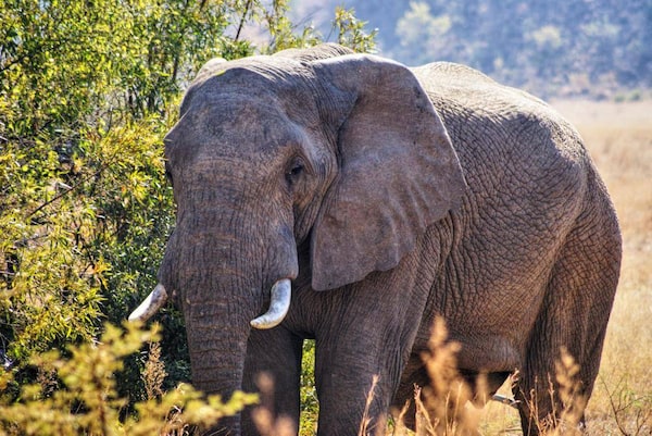 While we rattle along a side road, I notice a massive lump in the distance. Pilanesberg is tucked in the crater of an extinct volcano, and I've already been tricked by enough hefty boulders to know not to get my hopes up. But as we approach, I glimpse a flash of ivory, and the lump begins to move.