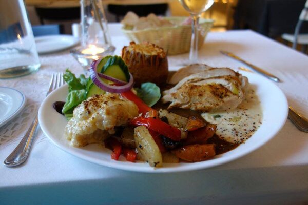 I choose an entrée of baked chicken breast stuffed with peppers, tomatoes, and onions with a cream mushroom sauce, accompanied by a healthy serving of root vegetables and cauliflower.