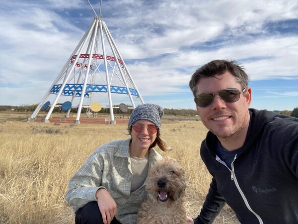 Writer Katie Hewitt with husband, Graham McCarthy, and their Wheaten terrier, Charlie, in front of the Saamis Tepee in Medicine Hat, Alta.Graham McCarthy/Supplied