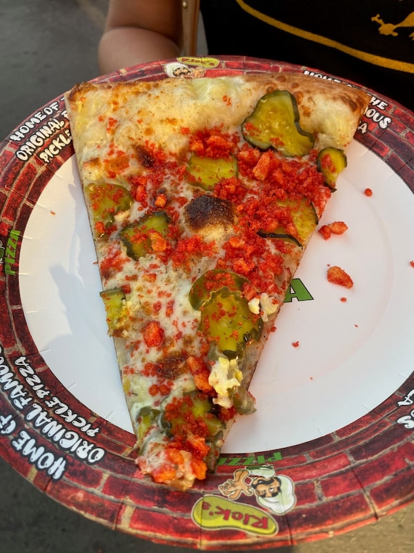 The Flamin’ Hot Cheetos dill pickle pizza is better than it sounds.Lara Pingue/Supplied