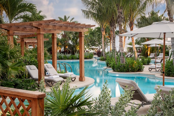One of the Rosewood’s two swimming pools meanders past daybed-equipped pergolas.Rosewood Baha Mar/Supplied