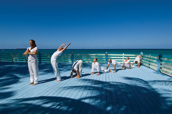 Visitors to the Sivananda Ashram on Paradise Island participate in a Sun Salutation yoga class.Sivananda Ashram