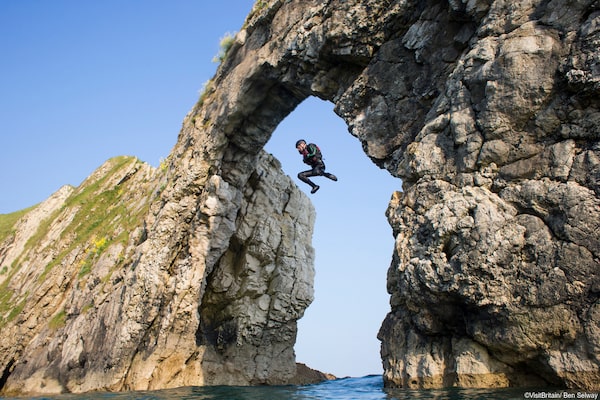 People leap from the Durdle Door limestone rock arch into the sea below, on the Dorset Jurassic coastline.©VisitBritain/ Ben Selway/Supplied