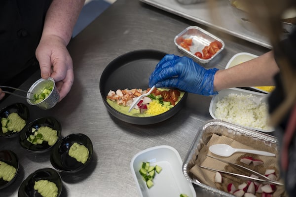 Molly Brandt prepares her Nova Scotian lobster cobb salad dip for a tasting presentation at Pearson Airport in Toronto, on April 15.Tijana Martin/The Globe and Mail