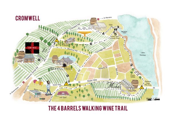 The 4 Barrels Walking Wine Trail is a self-guided, free tour that takes in four wineries in Cromwell (east of Queenstown) on an eight-kilometre loop, and can be completed in about four hours, including fairly leisurely tastings; a bit longer if you want to include lunch.