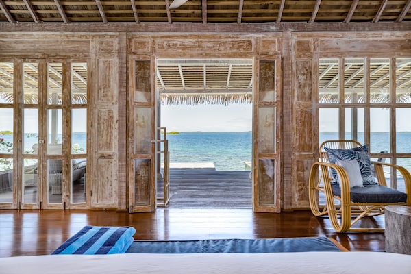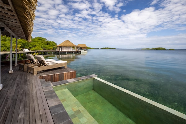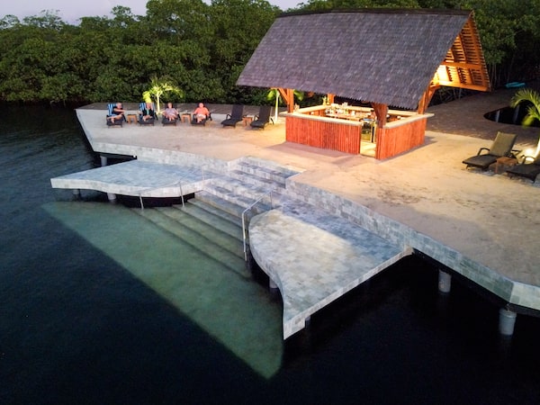 In the morning, the island fully reveals itself. When I step outside of my overwater villa, I see 15 more just like it dotting the shoreline. Each one was built in Bali and shipped here, where they sit atop stilts and are connected by boardwalks that zigzag throughout mangroves and lush tropical plants. Each villa has a bathroom big enough to do cartwheels in, a private deck (equipped with either a fire pit or a plunge pool) and an iPad for texting requests to eager-to-please staffers, available to you 24 hours a day. You want breakfast delivered to your deck at sunrise? Done. Staffers arrive stealthily by bike, balancing your meal above their heads in silver-domed platters before knocking on your door with a smile.