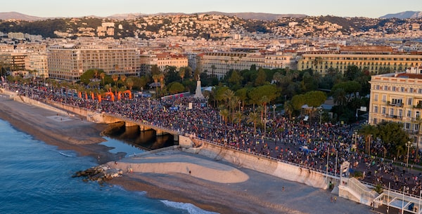 The race starts on the renowned Promenade des Anglais with the azure colours of the sea on one side and a procession of palm trees and elegant buildings on the other. Crowds cheer everyone on with calls of “Allez, allez!” and “Bravo!” from the get-go.