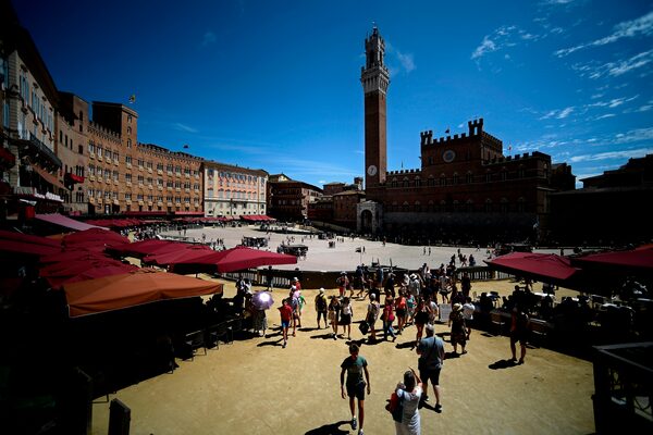 Tourists walk across the medieval square of Piazza del Campo on Aug. 15, 2019, in Siena, a day before the historical Italian horse race "Palio di Siena".FILIPPO MONTEFORTE/Getty Images