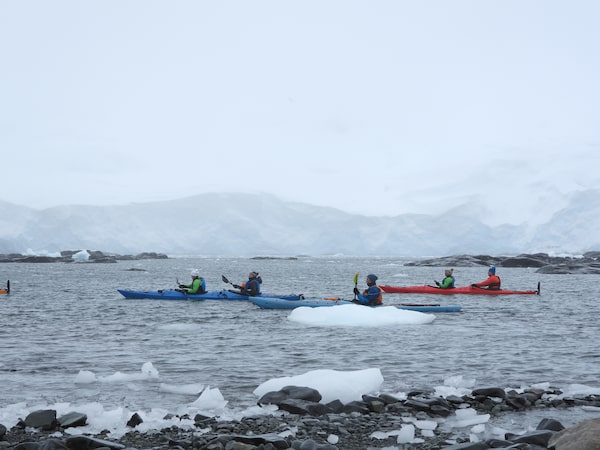 Kayakers paddle the waters off the shores of Antarctica during an 11-day cruise to the southern continent with Aurora Expeditions.Al Bakker/Supplied