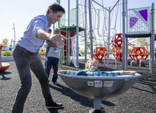 Prime Minister Justin Trudeau plays with his son Hadrien during a visit to Brampton, Ont., on Sept. 29, 2023.Frank Gunn/The Canadian Press