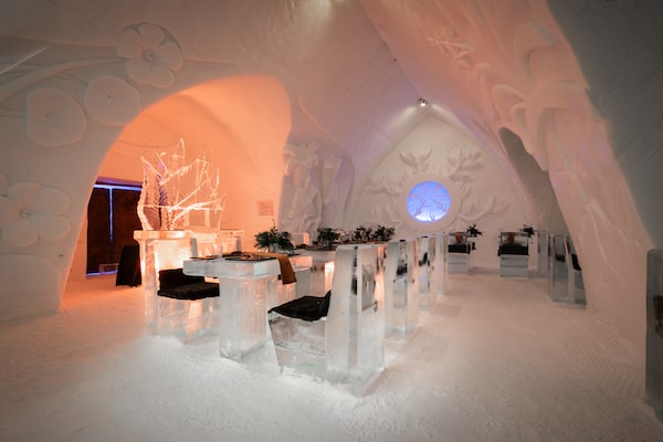 Guests can dine at a table made of ice at the Restaurant de l’Hôtel de Glace.Supplied