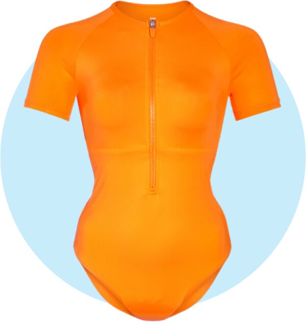 Great for water sports, volleyball on the beach or just lounging by the pool, this short-sleeve zip swimsuit by Toronto label Knix is self-lined and has an internal shelf bra.