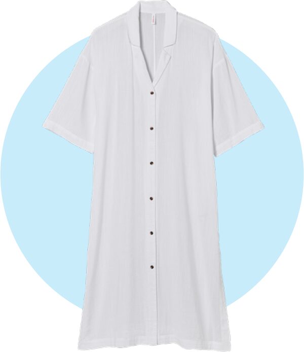 The notch collar and full-button closure elevate this affordable swim cover-up, made with a sheer, cotton-blend fabric.