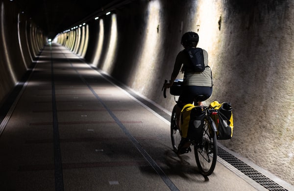 Cycling through the Old Caoling Tunnel, a two kilometre former rail tunnel converted into a bike path in New Taipei.Annie Burns-Pieper/The Globe and Mail