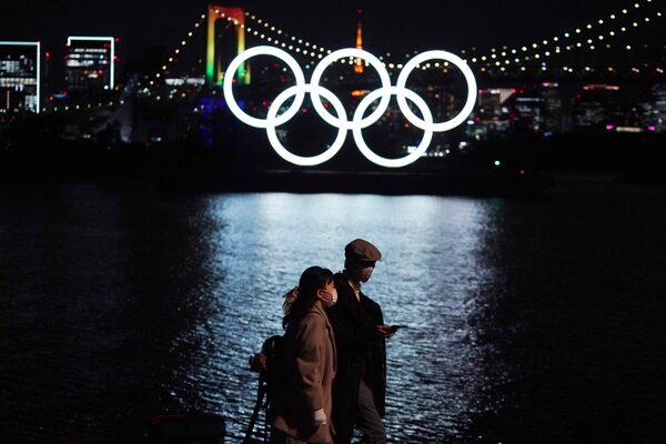 Masked pedestrians walk near the Olympic rings in the Odaiba section of Tokyo on Dec. 1.Eugene Hoshiko/The Associated Press/The Associated Press