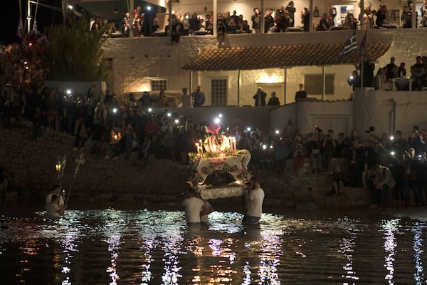 On the Greek island of Hydra, a bier is carried into the sea last April for a Greek Orthodox Good Friday ritual mourning the death of Jesus.Petros Giannakouris/The Associated Press