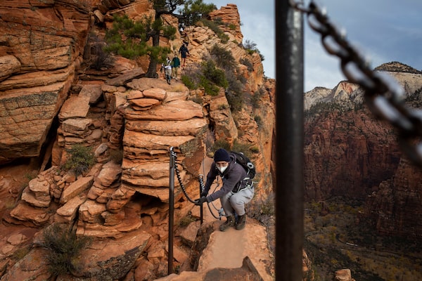 Masked hikers travel a portion of the Angels Landing Trail in Zion National Park this past November.Nikki Boliaux/The New York Times